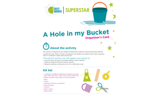 - This activity is designed to get children thinking about materials, liquids and testing methods. Can they find something that will stop a bucket from leaking?#SuperStar#Investigate#Materials#ProblemSolving